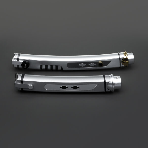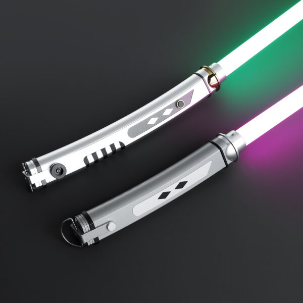 The Ahsoka Tano Rebellion Lightsabers are a faithful replica of the dual sabers wielded by Ahsoka during Star Wars: Rebels and the Ahsoka series. This set includes both her standard lightsaber and the shorter shoto saber, designed for her precise and acrobatic combat style. The hilts feature a sleek, curved design with a silver finish and dark inlays, capturing the refined, katana-like aesthetic seen on screen. The unique curvature enhances manoeuvrability, allowing for swift and fluid strikes. A ring attachment at the pommel further adds to their authenticity.
