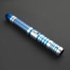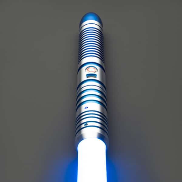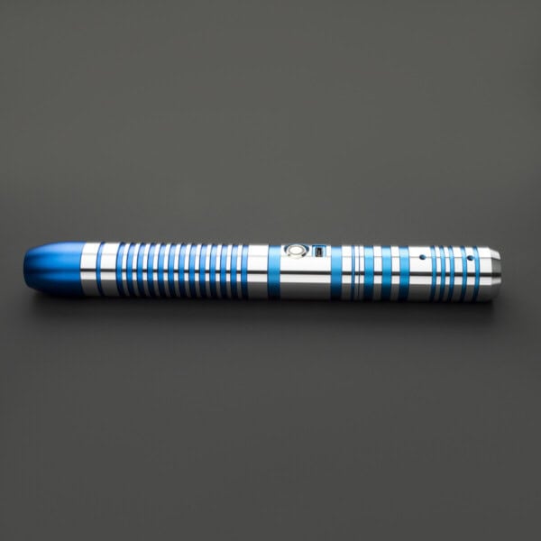 The Droid Lightsaber is a sleek and futuristic weapon, designed for those who appreciate precision, innovation, and a cutting-edge aesthetic. The hilt features a finely machined silver body with intricate blue ribbed grooves, providing a secure grip while reflecting the mechanical elegance of droid craftsmanship. The contrasting blue pommel and emitter add a touch of utilitarian design, reminiscent of droid components fused into a powerful combat tool. The illuminated activation switch, positioned conveniently along the hilt, ensures quick and reliable operation.