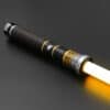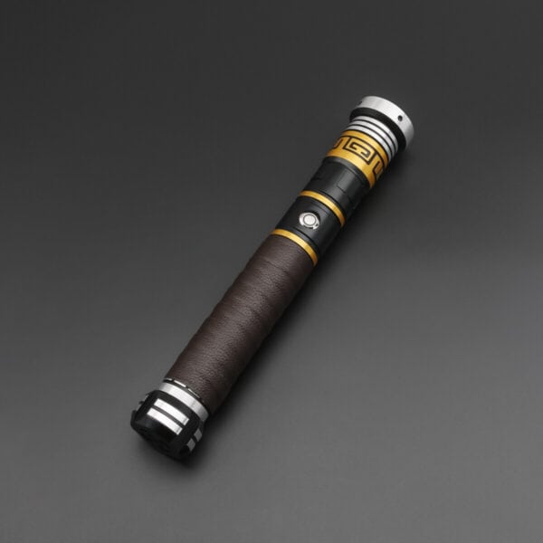 The Acolyte Lightsaber features a striking combination of polished silver and black, complemented by bold golden accents and geometric engravings that give it a distinctly ancient and arcane look. With its symmetrical design and tapered grip, this saber balances elegance and intimidation—ideal for users drawn to aesthetics inspired by the darker side of the Force. The control button is discreetly integrated into the design for seamless usability without disrupting the overall flow of the hilt.