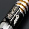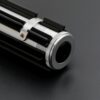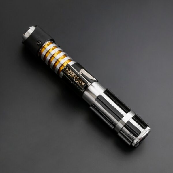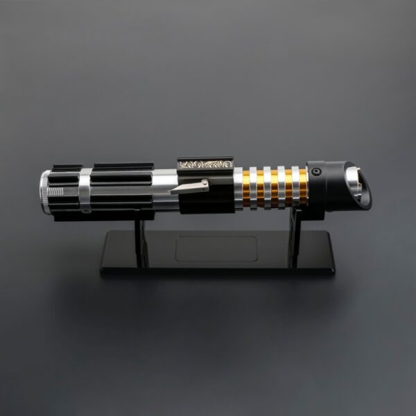 The Elzar Mann Lightsaber is a refined and elegant weapon, inspired by the High Republic Jedi Master known for his innovative and unorthodox use of the Force. This saber features a clean, silver-and-black hilt with gold ringed accents at the emitter, providing a distinct visual contrast that highlights its graceful design. The control box and squared pommel echo classic saber styling, while the balanced proportions make it suitable for both display and light duelling.