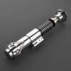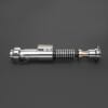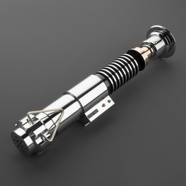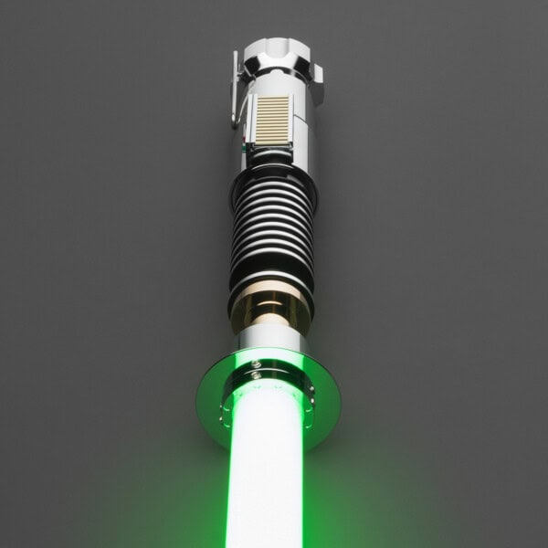 The Luke Skywalker EP6 Lightsaber is a replica model inspired by Star Wars Episode VI: Return of the Jedi. This elegant weapon features a polished silver hilt with black grip ridges, a gold emitter neck, and an iconic control box, staying true to its cinematic design.