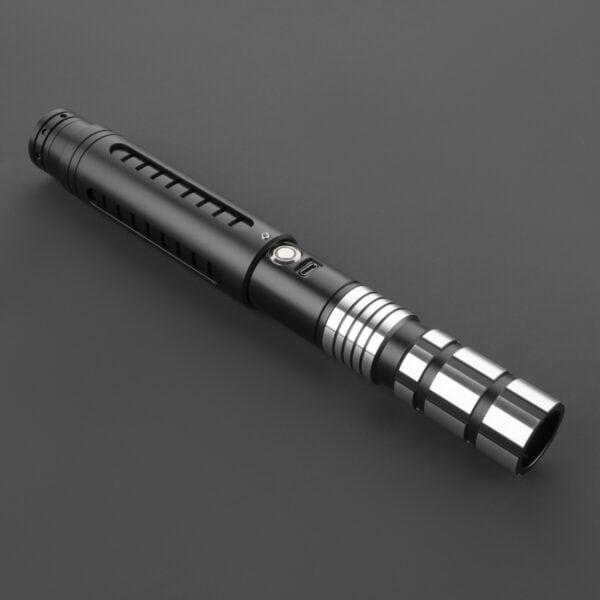 The Surge Lightsaber is a striking, modern design that combines functionality with a bold aesthetic. The hilt features a sleek black body with precision-cut silver accents, offering a firm yet comfortable grip. Its vented design enhances airflow while maintaining a lightweight yet durable aluminium alloy construction, making it an excellent choice for duellists and collectors alike. The unique emitter design adds to the saber’s aggressive look, making it stand out as a formidable weapon.